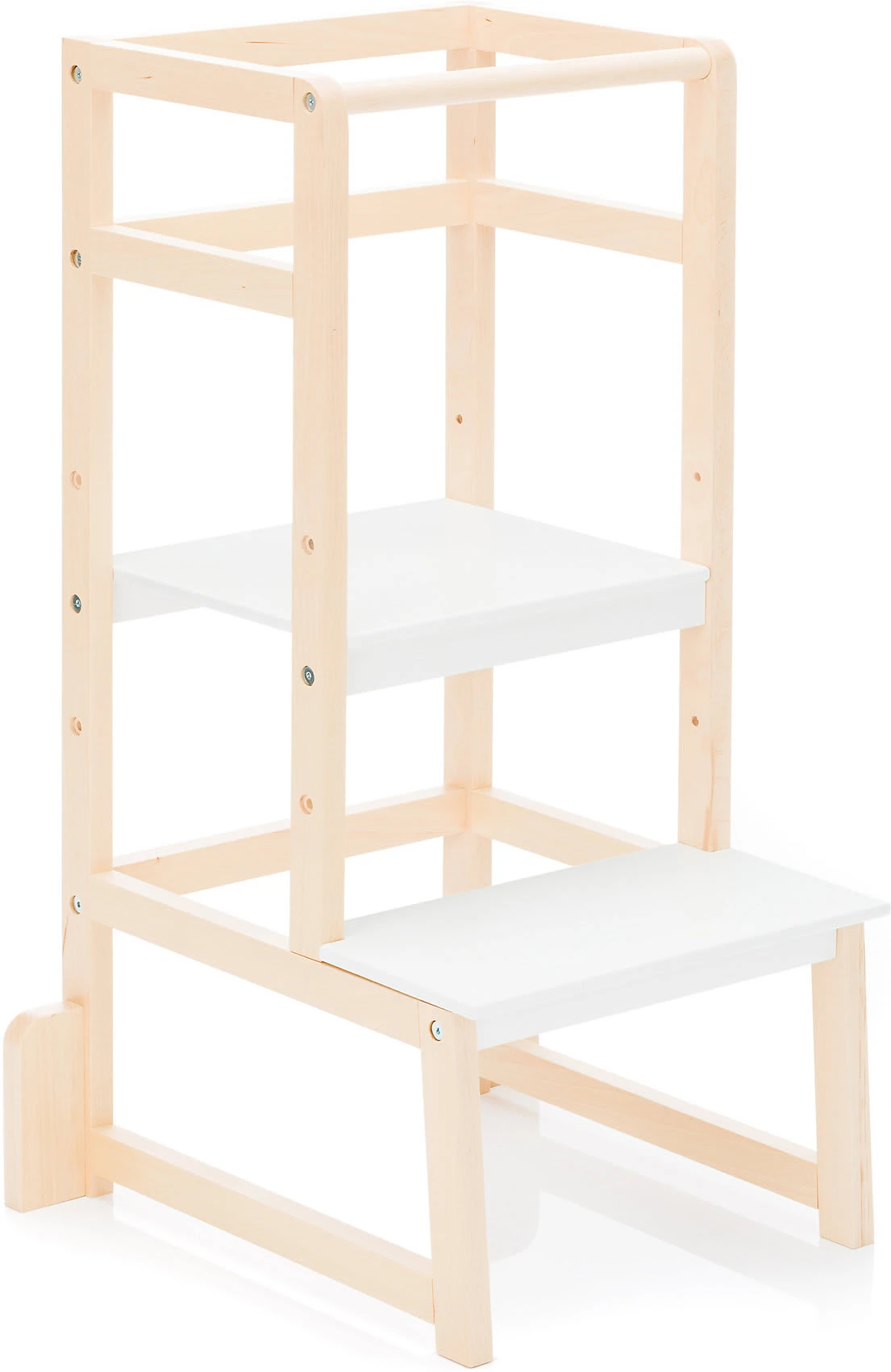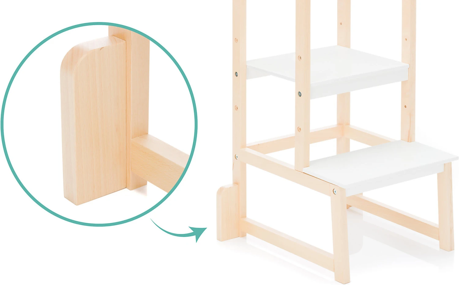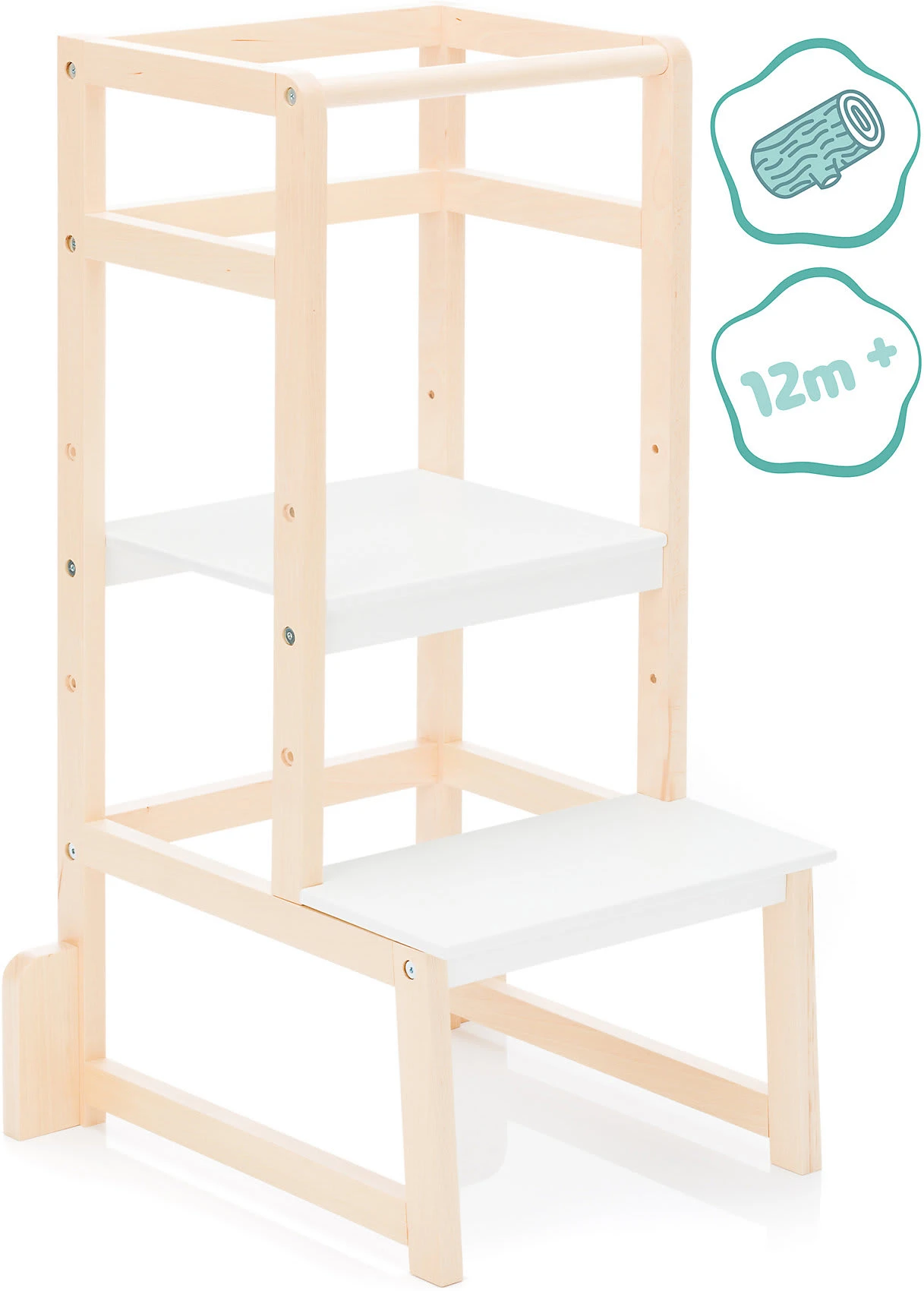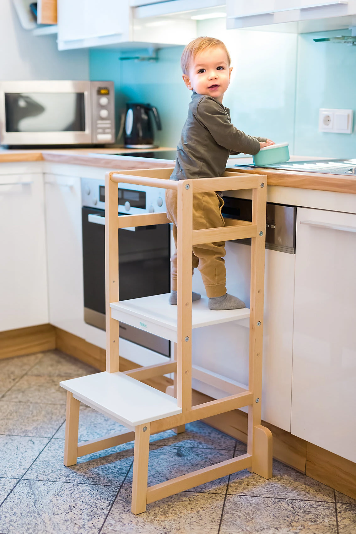 Der Lernturm „Vista“ von fillikid ist perfekt für Kleinkinder, die immer selbstständiger werden und aktiv den Alltag mitgestalten möchten, doch nicht immer überall herankommen. Der umlaufende Rausfallschutz verhindert dabei zuverlässig ein Herunterfallen oder ins „Leere“ treten. Dank der dreifach höhenverstellbaren Trittfläche kann sich der Lernturm individuell an die Größe der Kinder anpassen. So können sie beim Kochen oder Backen jederzeit auf Augenhöhe zuschauen oder sogar mithelfen.