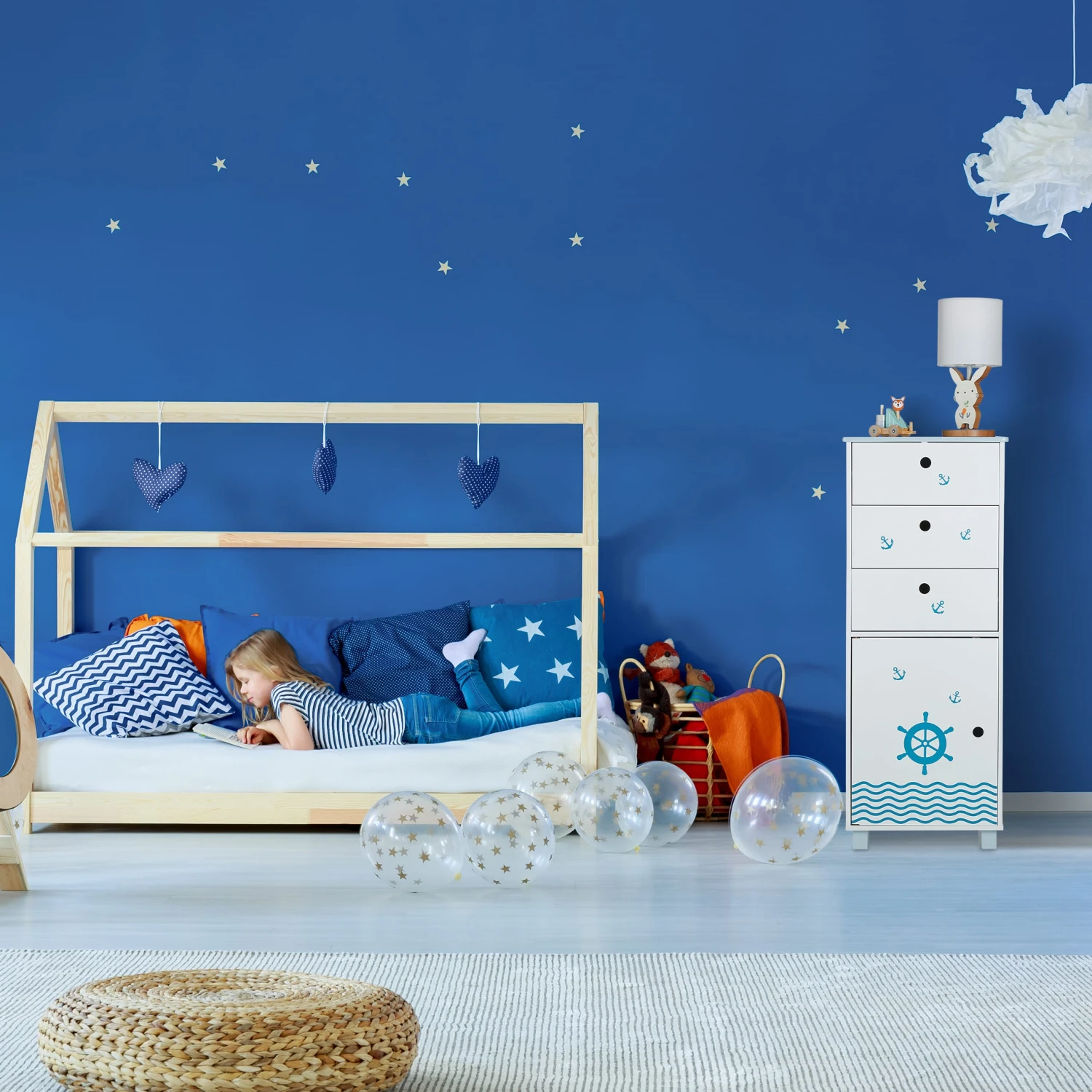 Diese schmale Kinderkommode passt perfekt ins Kinderzimmer und eignet sich bestens für ungenutzte Nischen. Für viel Stauraum sorgen die 3 Schubladen und das große Türfach des Kinderkommodenschranks. Durch seine abgerundeten Ecken und den Wandhaken ist der Schubladenschrank besonders sicher. Die kindgerechte Höhe macht ein selbständiges Ein- und Ausräumen problemlos möglich. Das coole Seefahrt-Design mit wogenden Wellen, Anker und Steuerrad begeistert alle Kinder.