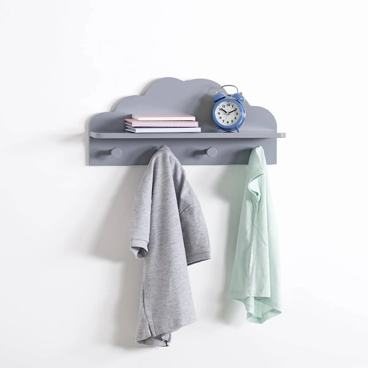 Praktisches Regalbrett für Kinderzimmer mit Haken. Das Regalbrett ist mit 3 Haken zum Aufhängen von Kleidung ausgestattet. Hergestellt aus lackiertem MDF auf Holzbasis. Solide und langlebige Konstruktion. Perfekt nicht nur für zu Hause, sondern auch für Kindergarten oder Schule.