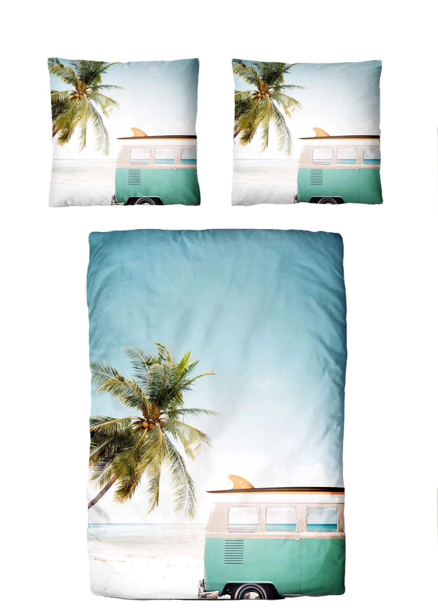 Diese Bettwäsche vermittelt das Gefühl, an einem tropischen Strand zu liegen und sich in den Ferien zu befinden. Die Palme spendet Schatten und der türkisfarbene Bulli Bus erweckt das Gefühl von Freiheit und Abenteuerlust. Mit dem Surfbrett auf dem Dach scheint es, als ob man jeden Moment in die Wellen springen und surfen könnte. Die friedliche Szenerie ist vollkommen, mit einem hellblauen Himmel, der das Bild perfekt abrundet. Die Bettwäsche sorgt dafür, dass man sich auch zu Hause wie im Urlaub fühlt und verleiht dem Schlafzimmer eine sommerliche Atmosphäre.