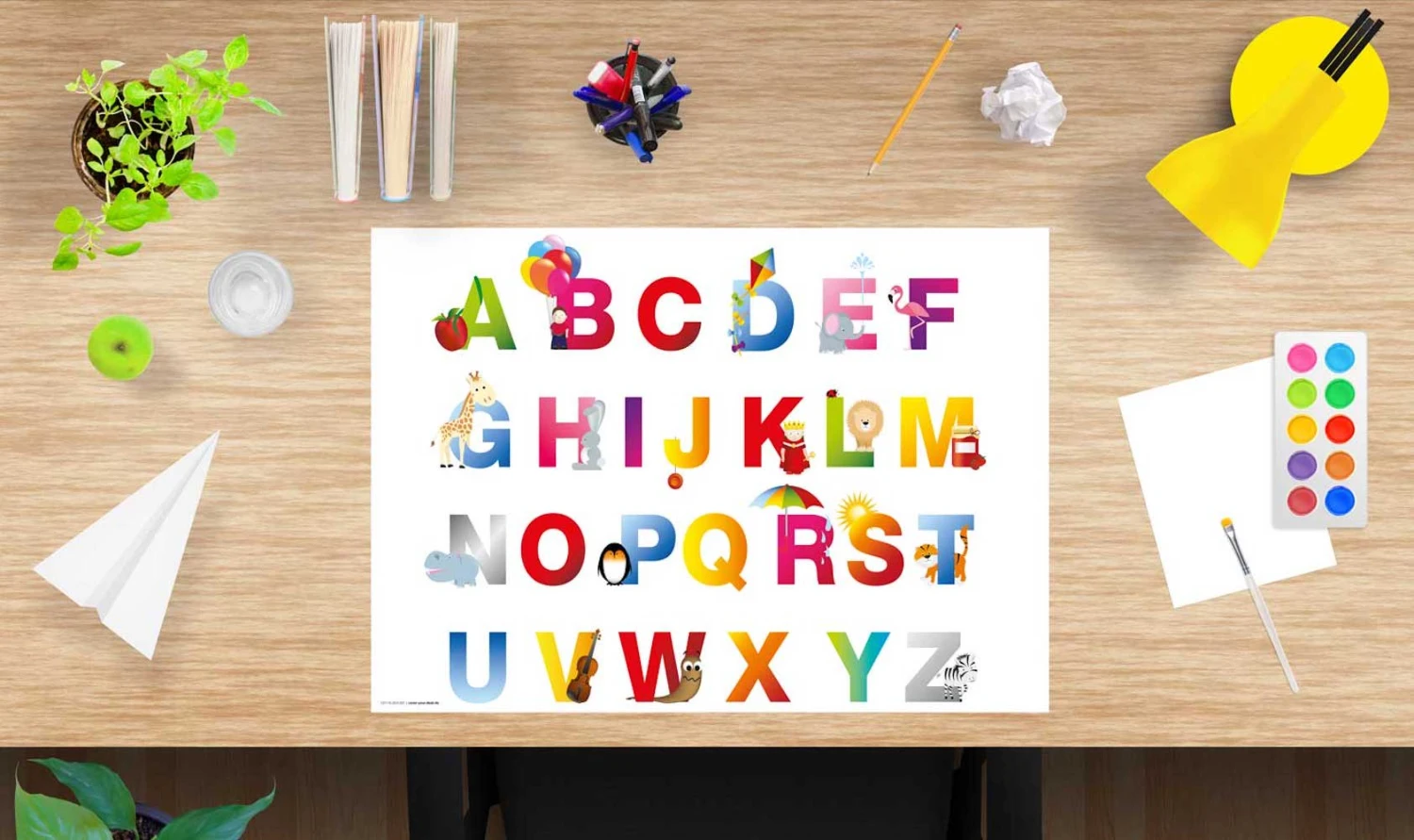 Ein Motiv mit Lerneffekt – das ABC in Großbuchstaben bunt und kreativ dargestellt. Perfekt für Kinder und junge Schüler. So lernen sie spielend leicht und bekommen zugleich eine praktische Schutzmatte für den Schreibtisch!
